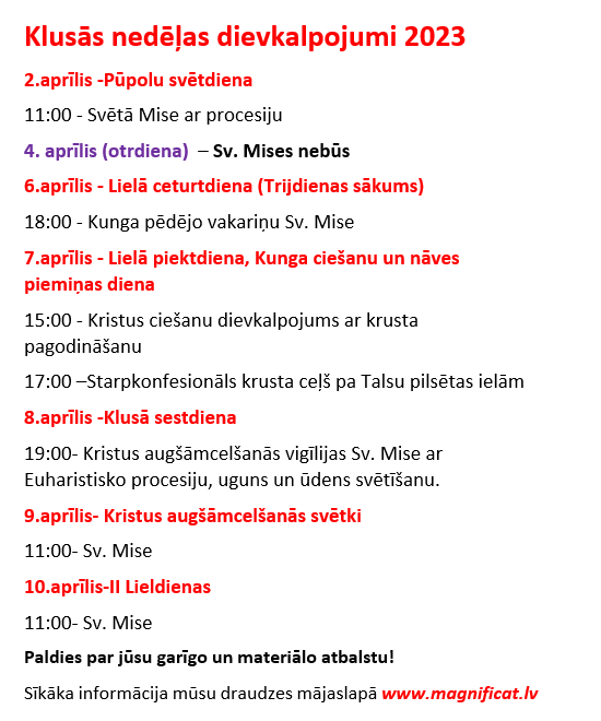 - trešdien, 29. martā Sv.Mise plkst. 9.00. Pēc Sv. Mises – Krusta ceļš, adorācija, Rožukronis. Iespēja saņemt Grēksūdzes sakramentu.