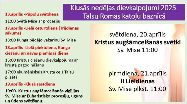 - Lielās nedēļas trešdiena, 16.aprīlī – Sv. Mise plkst. 9:00